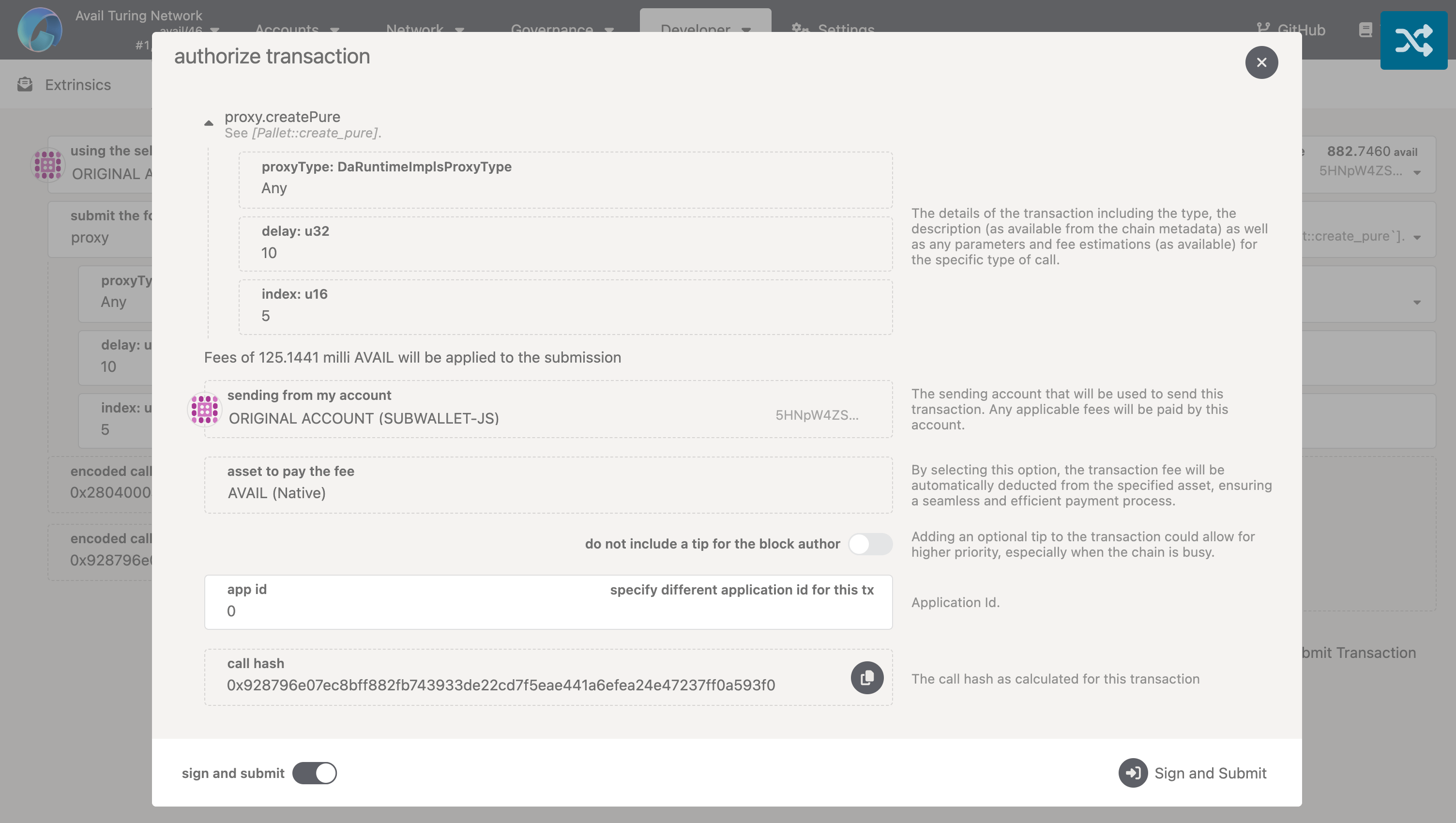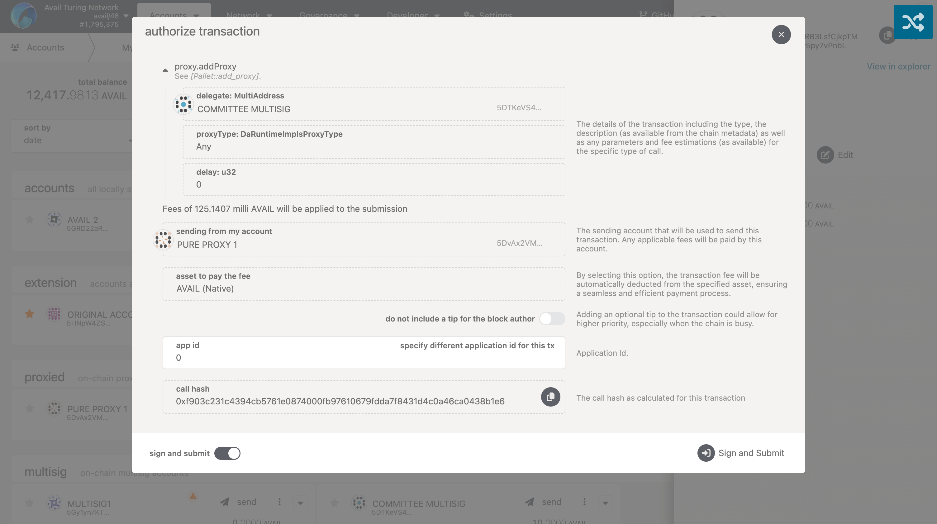 2. Review the transaction details and submit it by clicking on the ‘Sign and Submit’ button.
