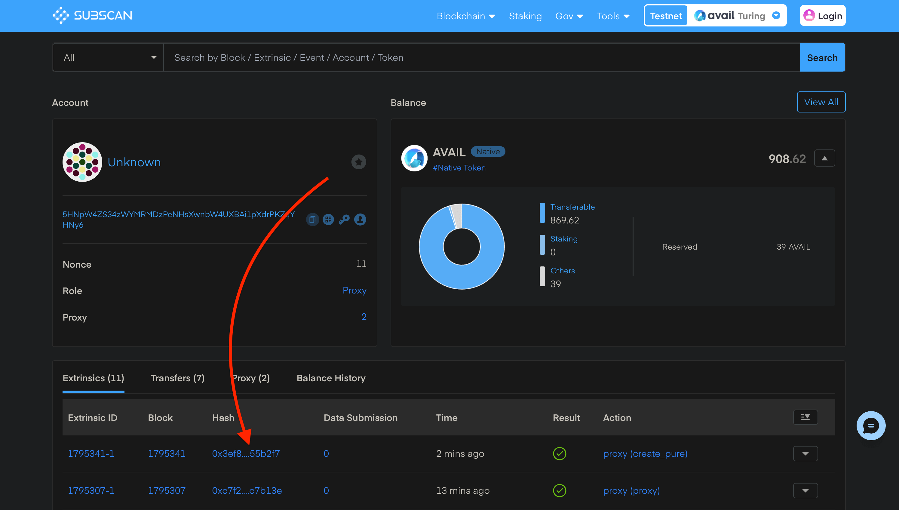 Head on over to the accounts section of the Avail explorer  and connect your main account. In my case, I start out with the highlighted account.