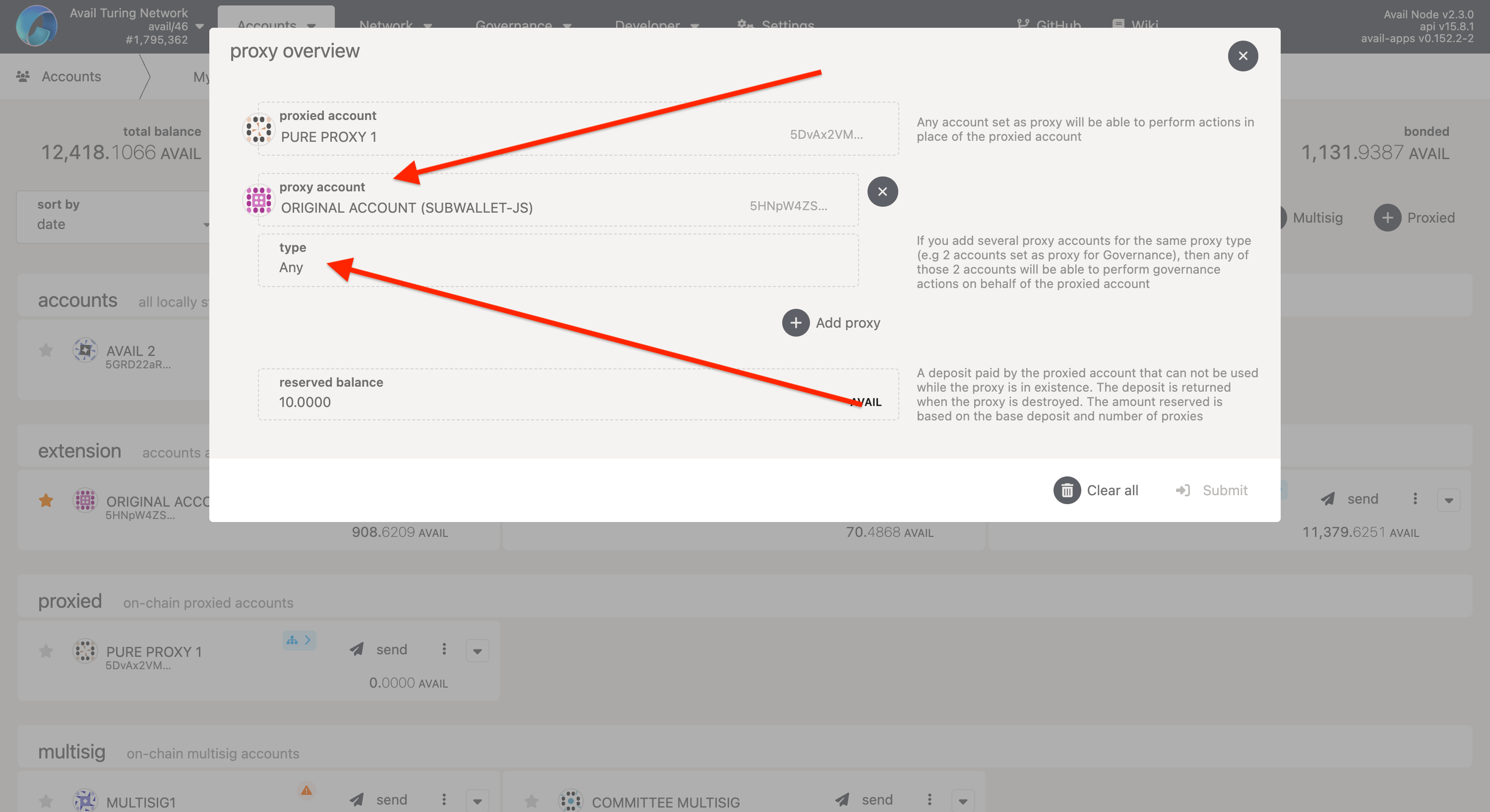 1. Check that the pure proxy address is listed under the ‘Proxied’ section, and that your original account is set up as an any proxy for the pure proxy.